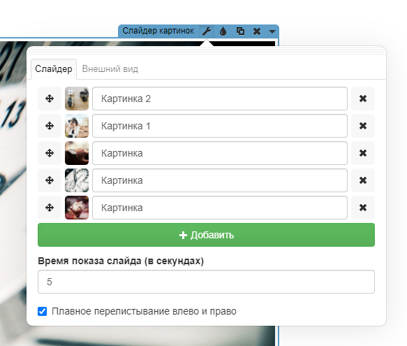 На первой вкладке можно добавить слайды или поменять их местами, изменить время показа.