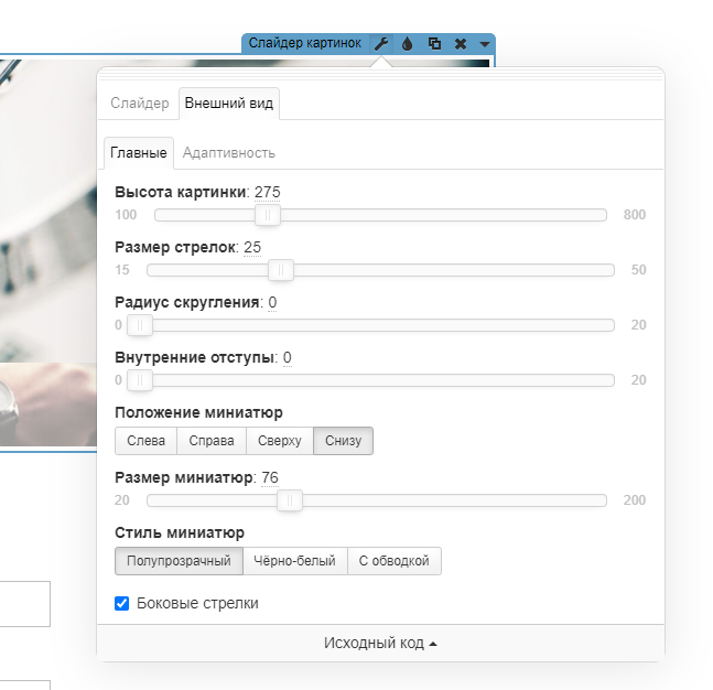 Слайдер с возможностью предпросмотра картинок реализуется с помощью специального "HTML-виджета".