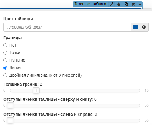 В виджете "Текст" есть возможность создать таблицу. А с помощью данного компонента устанавливаются видимые границы и отступы ячеек таблицы.