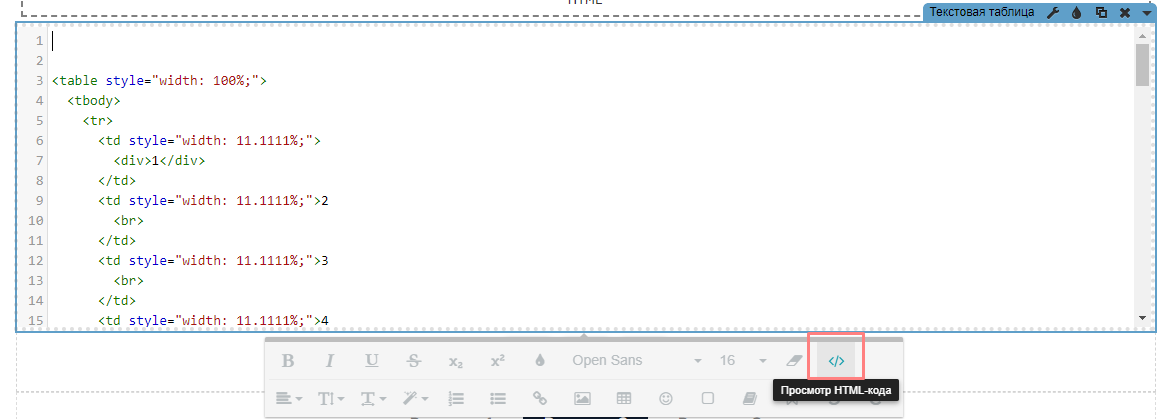 Если у вас уже есть своя готовая таблица, то при ее редактировании нажмите на**символ </> **на панели редактирования стиля текста, скопируйте весь код из окна и перенесите его в такое же поле с кодом от текстовой таблицы: