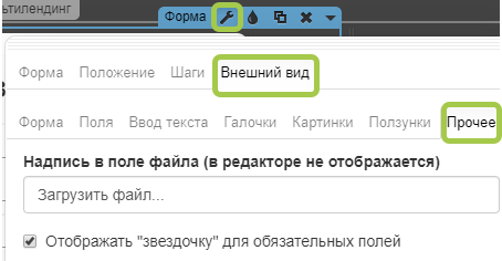 Скрытие "звездочек" для обязательных полей и изменение надписи у поля файла возможно на вкладке "Прочее".