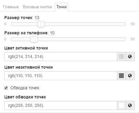 В настройках слайдера есть 3 вкладки - главные настройки, настройки боковых кнопок и точек.
