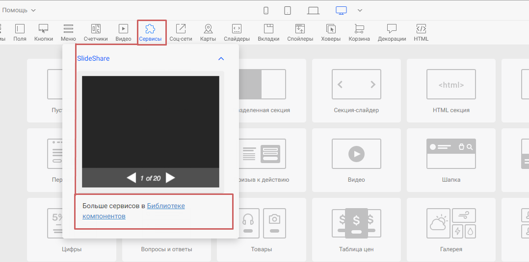 В редакторе страниц вы можете найти ссылки на библиотеку компонентов, в которой содержатся нестандартные виджеты.