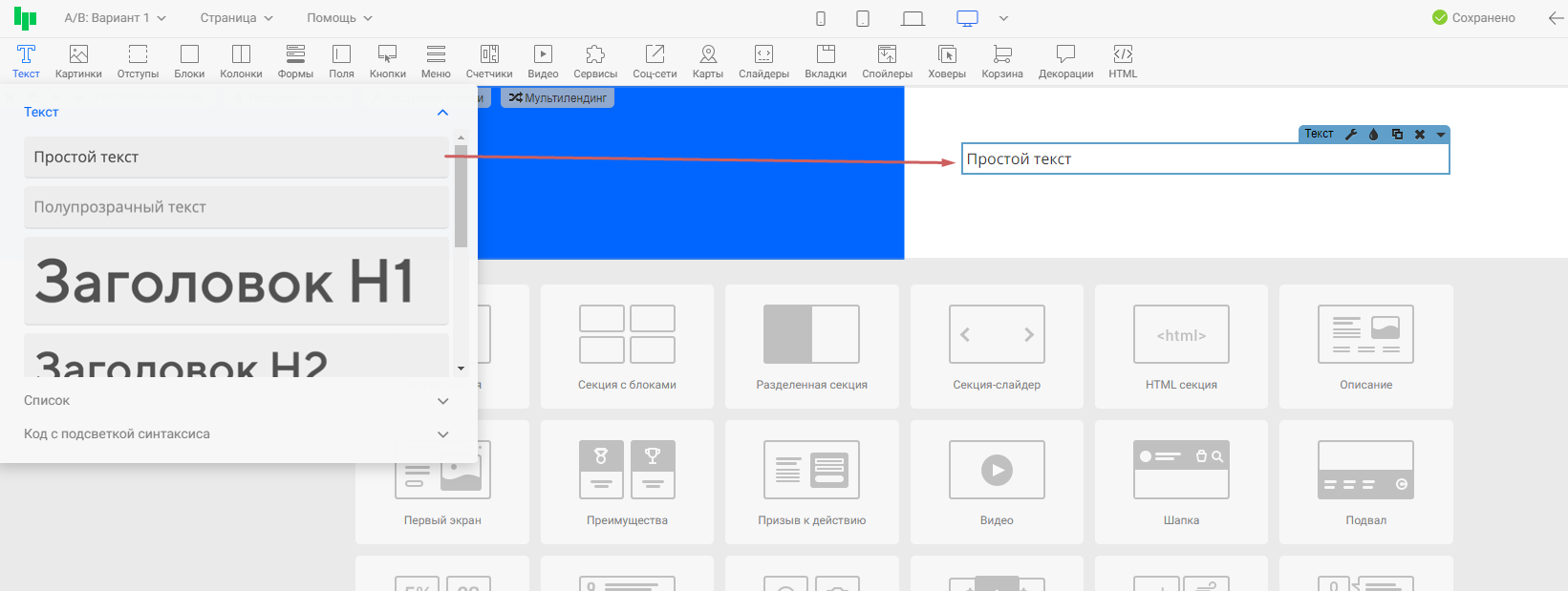 Далее - размещаем любой виджет (например, «Текст») в желаемом месте на странице.