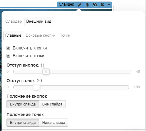В главных настройках возможно отключить кнопки и точки, изменить их положение, отрегулировать отступ от слайдера или внутри слайдера (в зависимости от положения элемента).