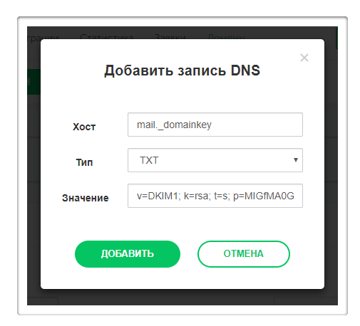 После того как Яндекс подтвердит наличие записей, которые мы добавили выше - можно добавить запись DKIM.