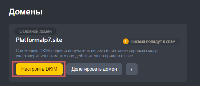 Когда Яндекс подтвердит наличие записей на домене - его статус изменится на «Письма попадут в спам », после добавления записи DKIM статус будет изменен на «Домен настроен ».