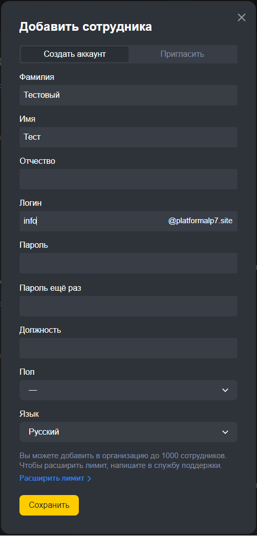Шаг 1. Заходим в панель администратора на Яндекс 360 и переходим в раздел «Сотрудники ». Далее, нажимаем на кнопку «Добавить сотрудника »