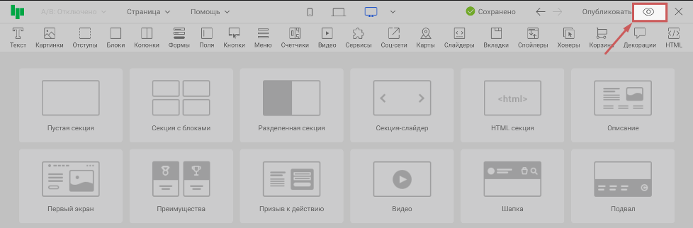 В предпросмотре можно увидеть, как страница выглядит в браузере и на разных устройствах.