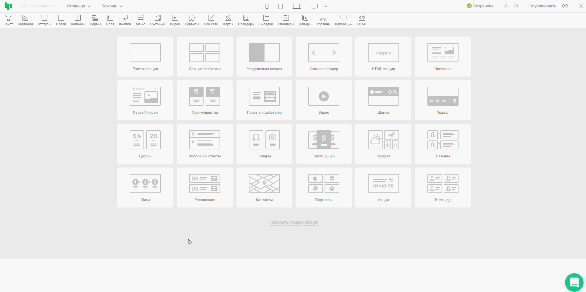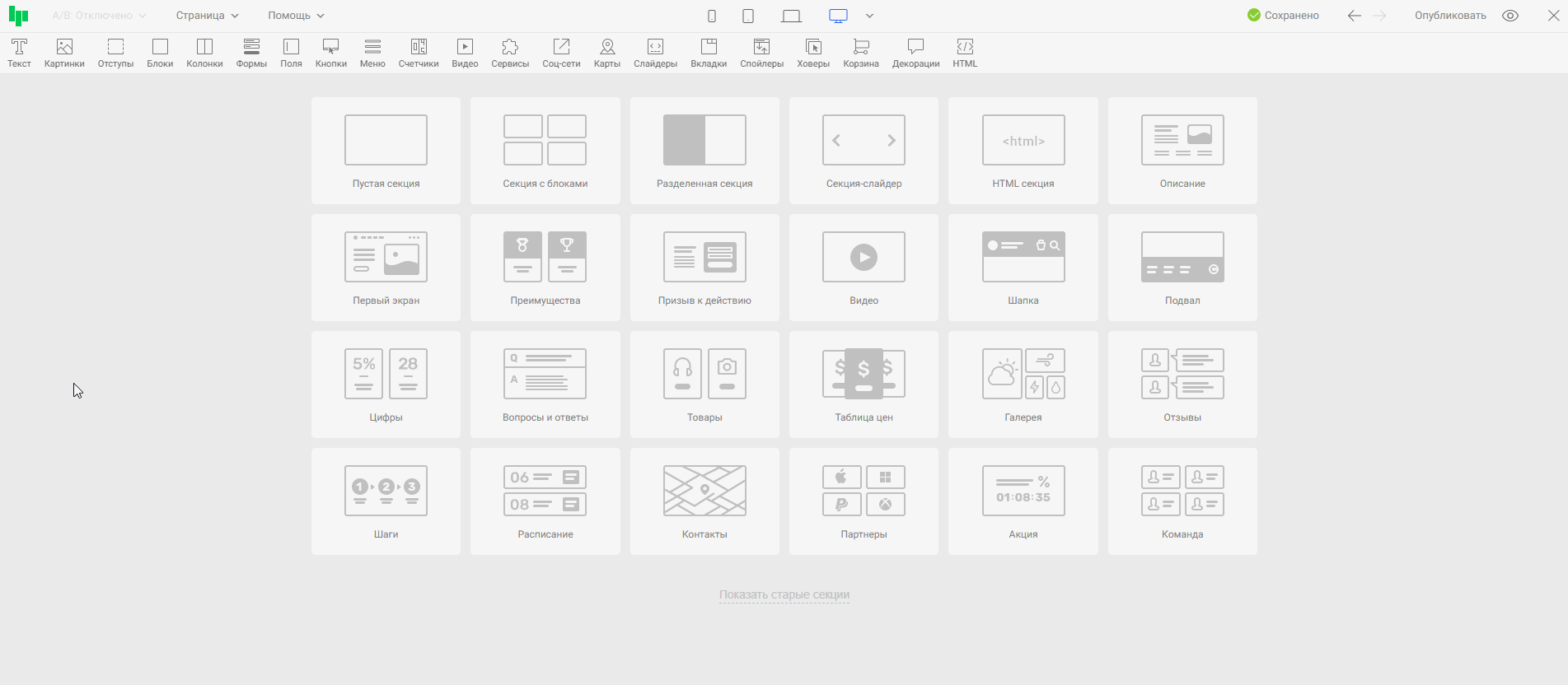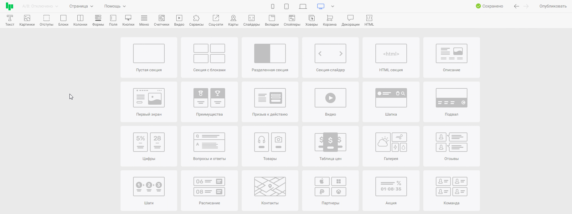Для быстрого поиска готовые секции разделены на категории: первый экран, шапка, подвал, список товаров, галерея, видео, отзывы и другие.