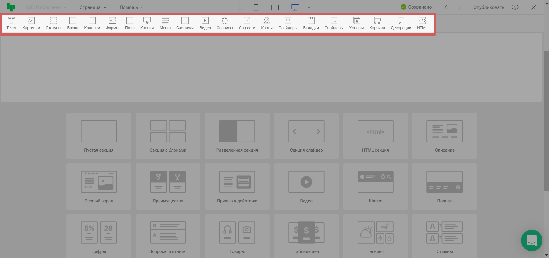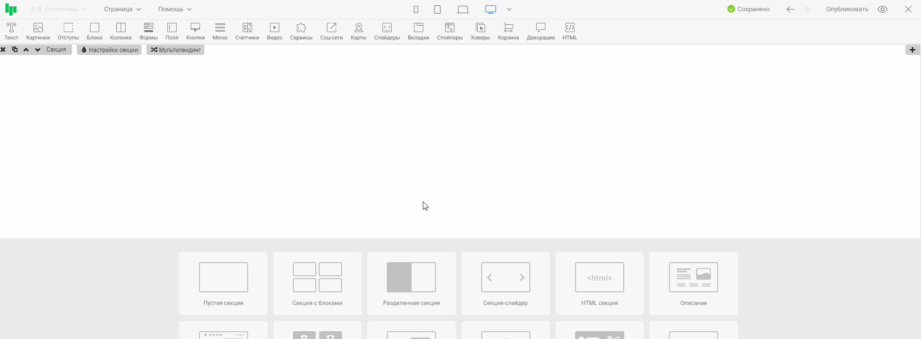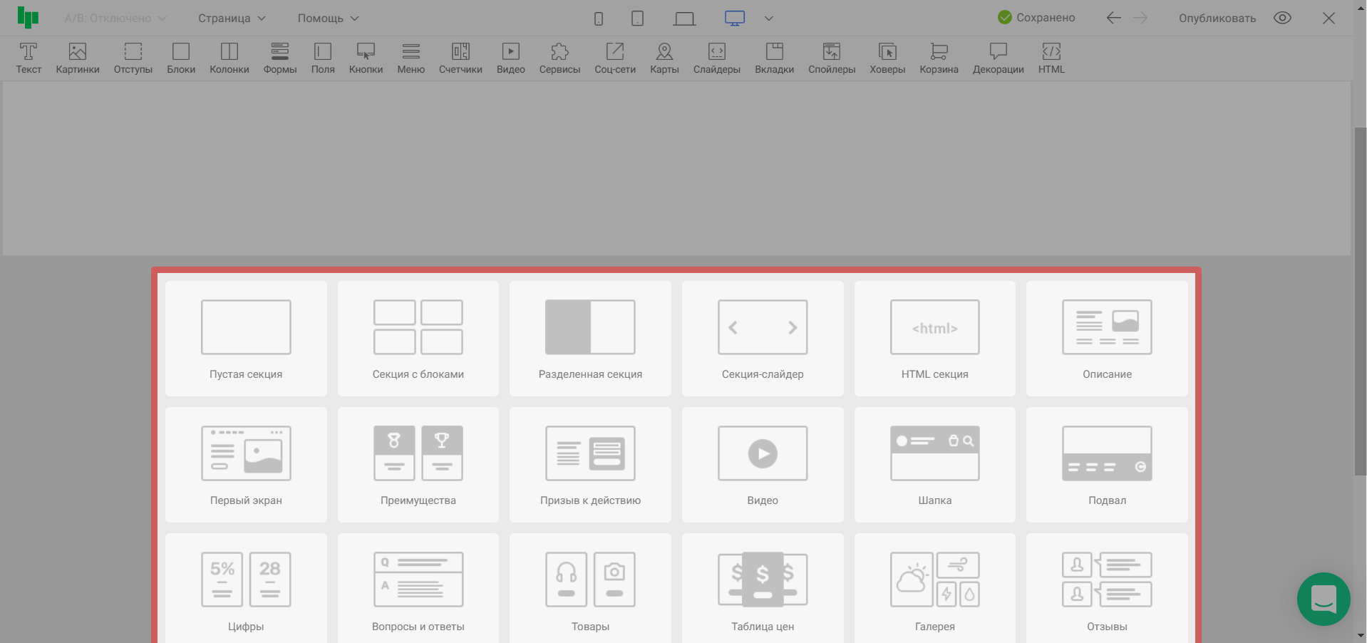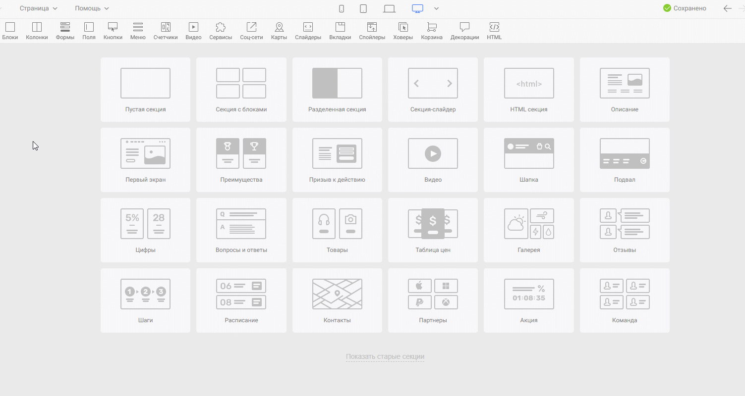 Готовые секции находятся в нижней части редактора: