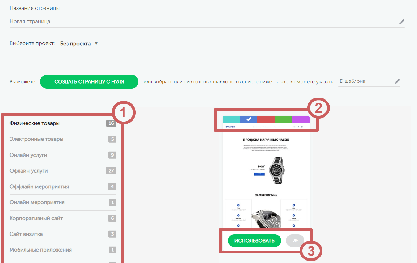 Нажмите на иконку глаза, чтобы полностью посмотреть шаблон, или наведите на него курсор и прокрутите колесом мыши. Чтобы создать страницу на этом шаблоне - нажмите на кнопку «Использовать».