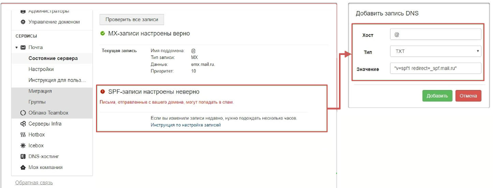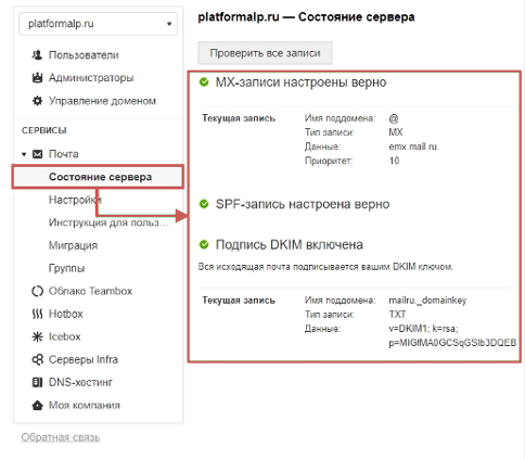 Проверить записи можно в кабинете сервиса**biz.mail.ru,** в разделе «Почта », во вкладке «Состояние сервера ».