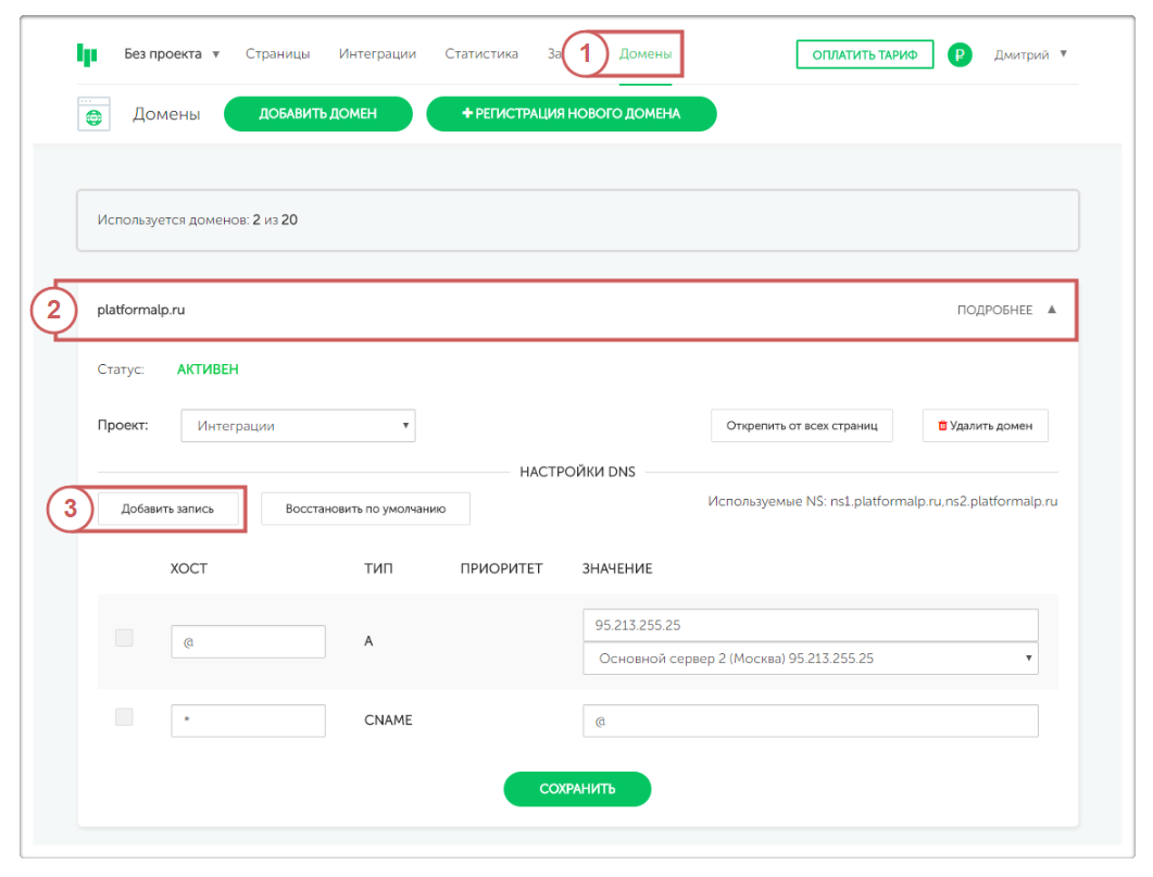 Шаг 2. Переходим в личный кабинет Платформы LP, во вкладку «Домены » и нажимаем «Добавить запись »: