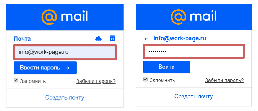 Войти на доменную почту можно так же, как на обычную. Для этого заходим на mail.ru. В качестве логина и пароля указываем те данные, которые мы зарегистрировали на biz mail, в разделе «Создаем новый электронный адрес ». На примере выше, мы создали адрес info@work-page.ru. Этот адрес и будет логином.