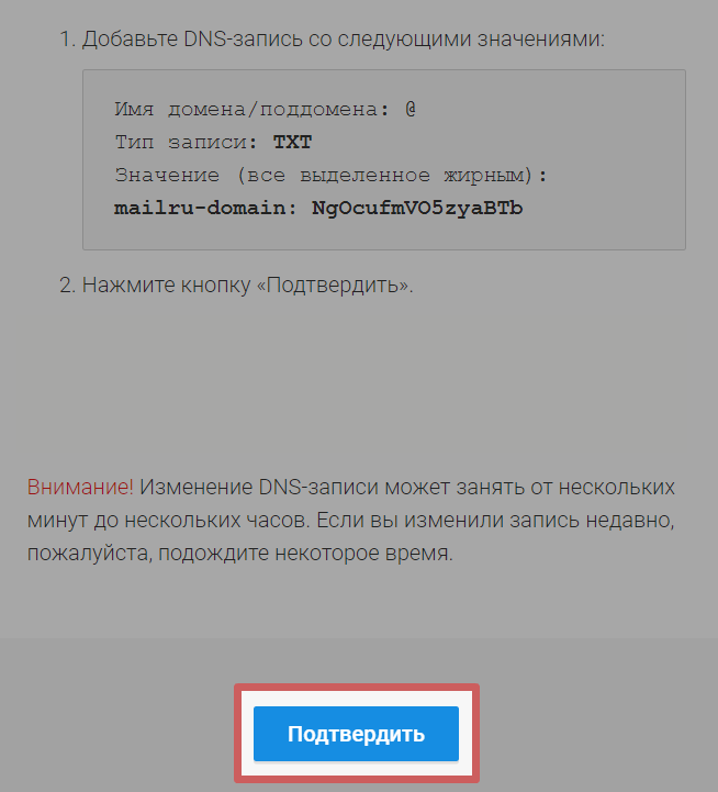 Шаг 3. Возвращаемся на страницу mail, где копировали значение записи. И нажимаем на кнопку «Подтвердить »: