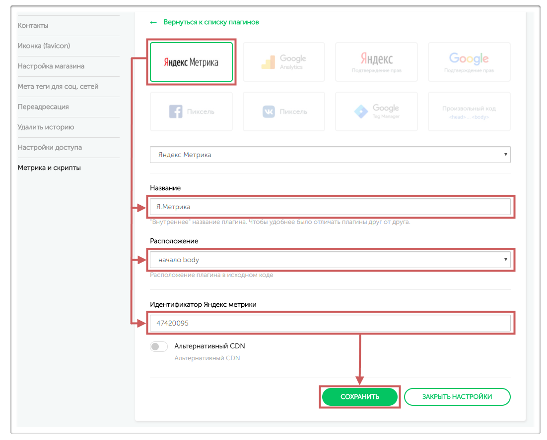 во вкладку «Метрика и скрипты» и нажимаем «Добавить плагин»