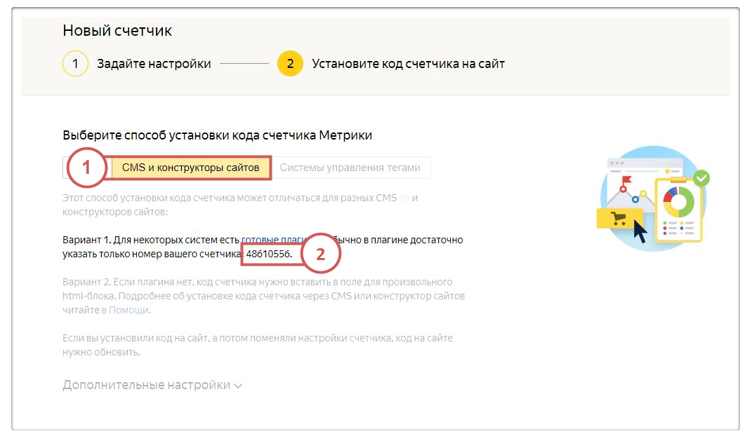 Выбираем способ установки: «CMS и конструкторы сайтов » и копируем номер счетчика из «Вариант 1 ».
