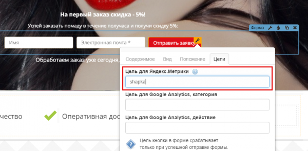 Переходим в редактор страницы и выбираем кнопку, которая ведет к целевому действию – например, «Оставить заявку ». В настройках кнопки нажимаем на вкладку «Цели » и вписываем туда идентификатор цели, которую указывали в личном кабинете на Яндекс.Метрике. Сохраняем.
