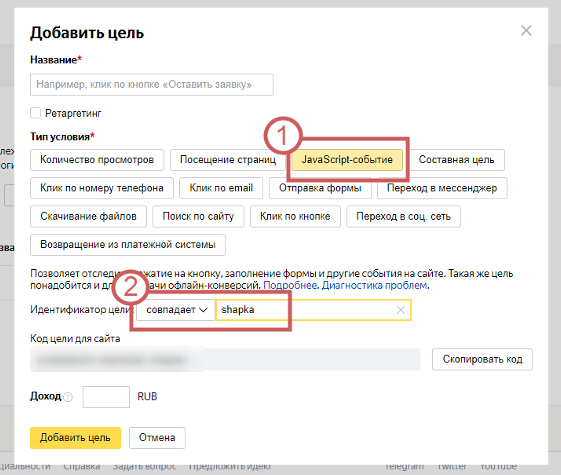 Нажимаем на «Добавить цель », выбираем вкладку «JavaScript-событие ».