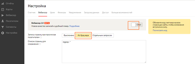 2. Убедитесь, что в настройках Вебвизора на стороне Яндекс выключен Вебвизор 2.0: