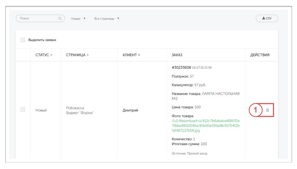 Шаг 1. Нажмём на черную иконку “Корзина ” для того чтобы перенести заявку в архив.