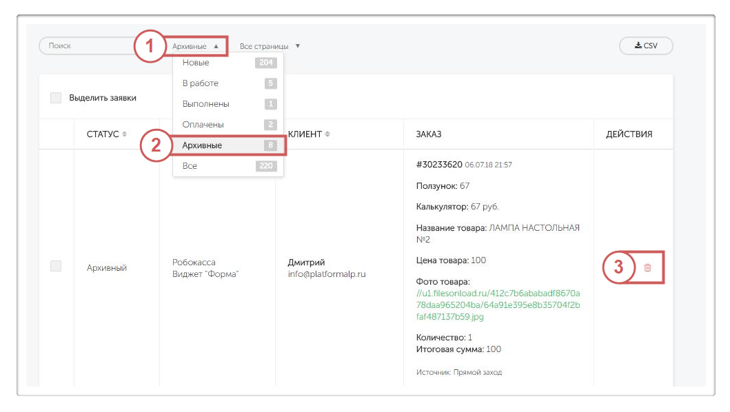 Шаг 2. Перейдем во вкладку “Архивные ” и удалим ненужную заявку с пересчетом статистики. Для этого нажмём на красную иконку “Корзина “.