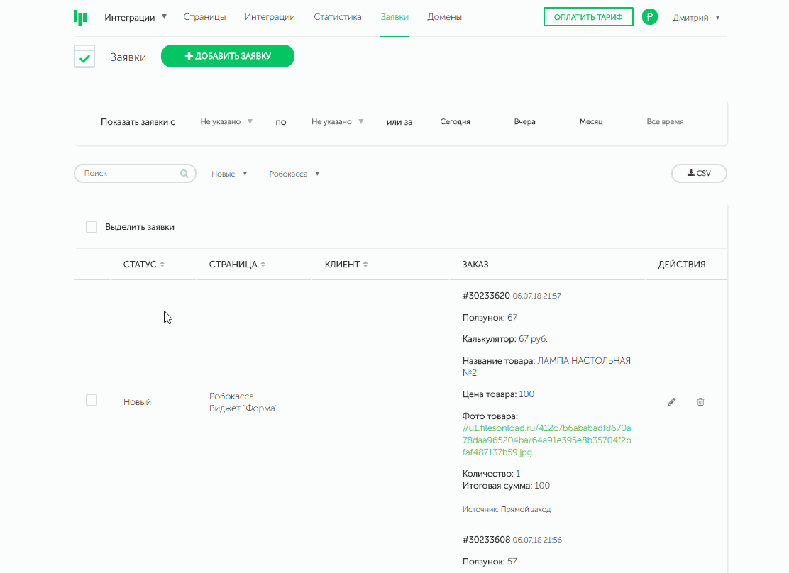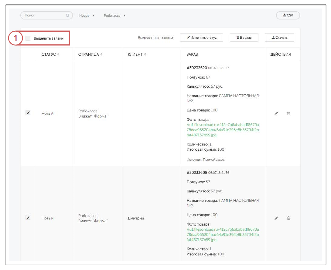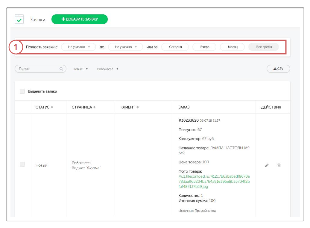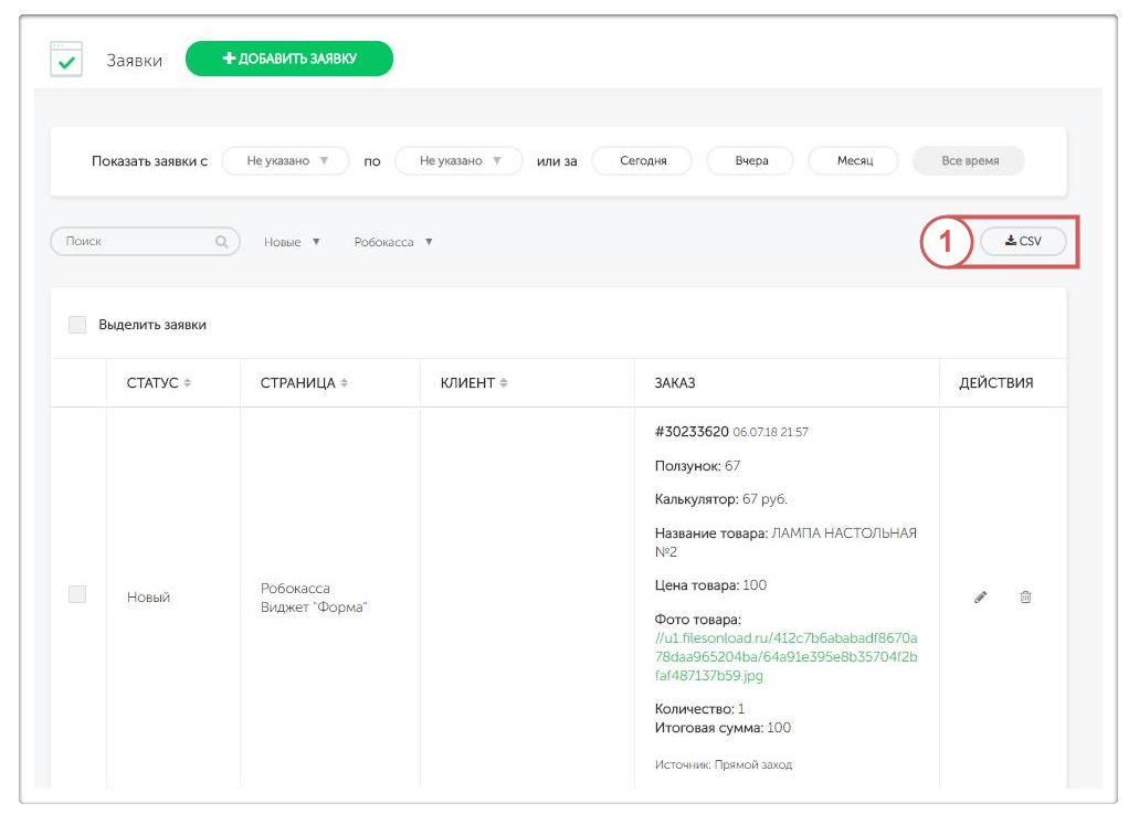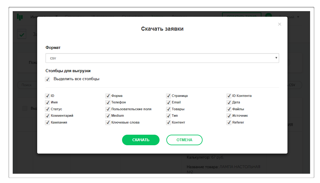 Скачать весь список заявок в форматах csv, отфильтровав нужные поля для выгрузки: