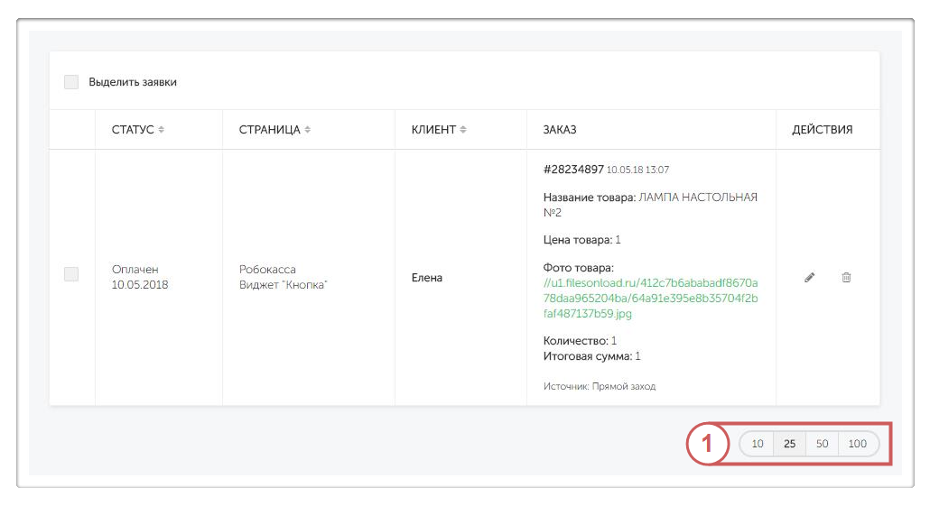Выбрать количество видимых заявок на странице можно внизу под списком.