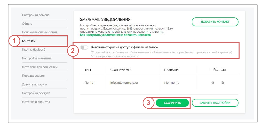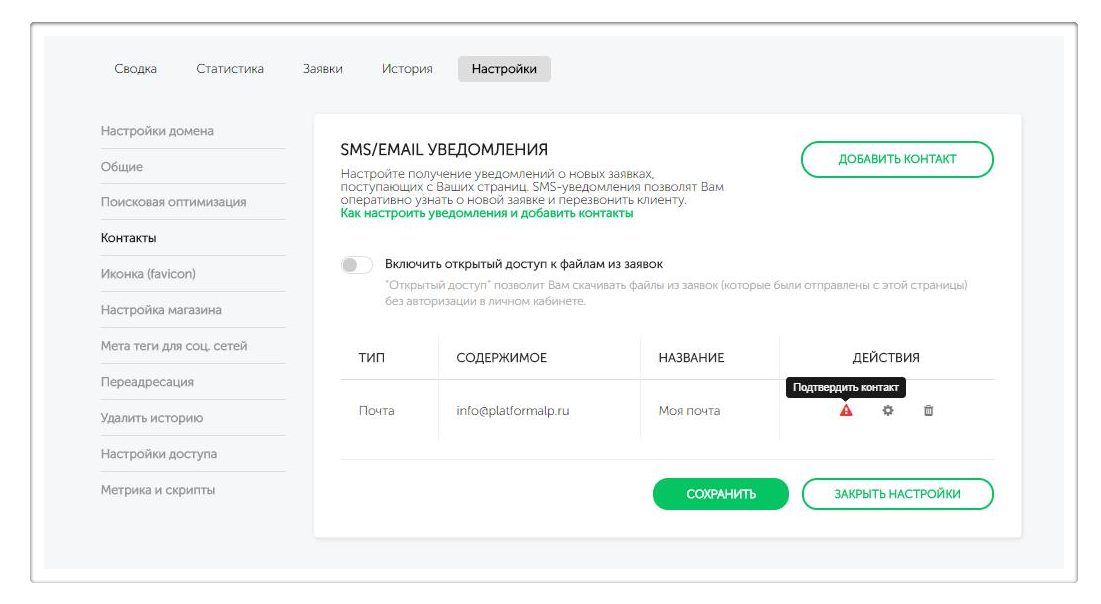 “Открытый доступ” позволяет скачивать файлы из заявок, которые были отправлены со страницы, без авторизации в личном кабинете.