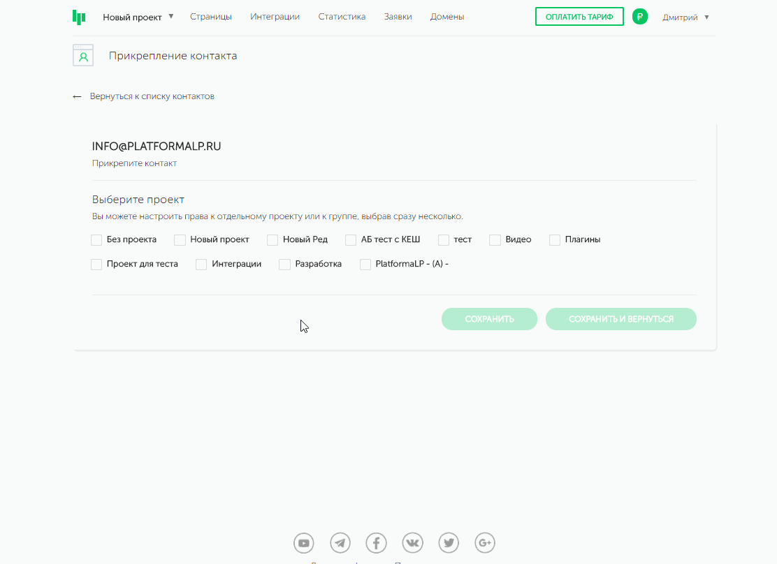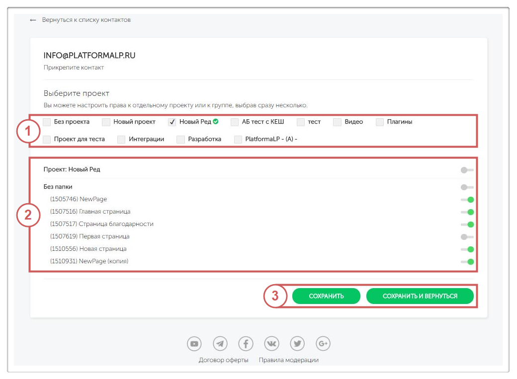 Шаг 2. Выбираем нужный проект, выбираем прикрепить контакт ко всему проекту, папкам или к нужным страницам.