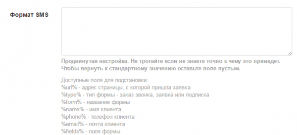 Формат приходящих заявок на email и/или sms настраивается через функцию «Расширенные настройки». Эта функция для продвинутых пользователей, поэтому мы не рекомендуем ее новичкам. Если не уверены, что вам это нужно – не пробуйте заполнять поля «просто так».