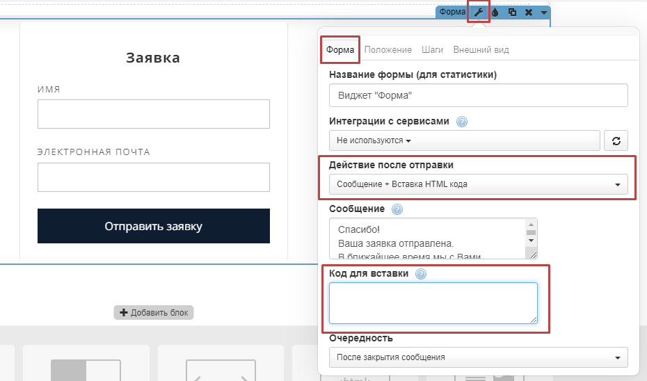 Во вкладке «Форма» находим графу «Действие после отправки». Выбираем «Сообщение + Вставка HTML кода».