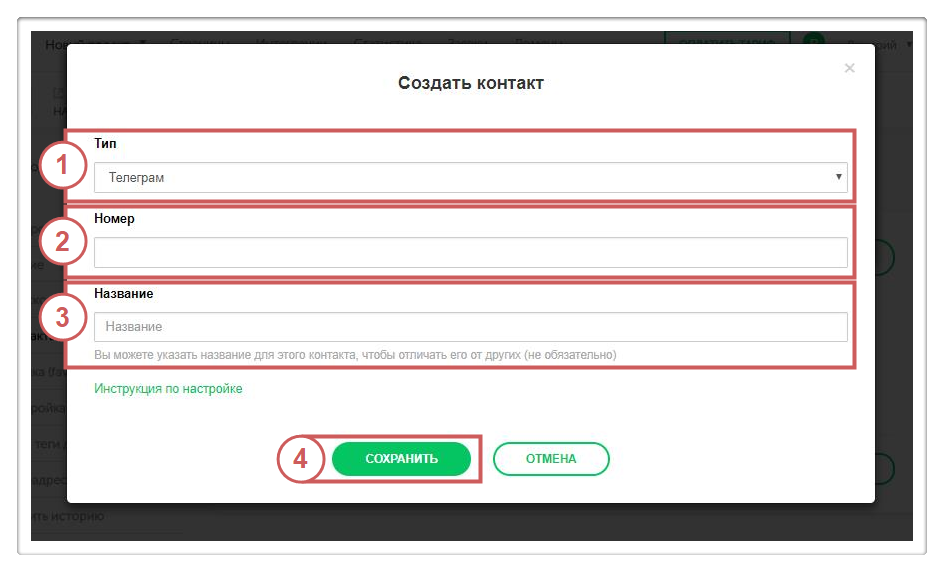 Шаг 2. При создании нового контакта выбираем Telegram и указываем номер телефона – аккаунта в Telegram, и нажимаем “Сохранить”