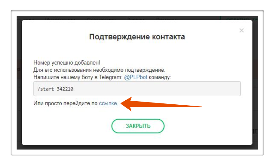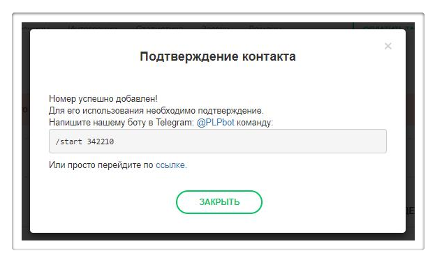 Шаг 3. Копируем код подтверждения – он выглядит как /start 342210, и заходим в Telegram. Ищем там контакт-бот @PLPbot
