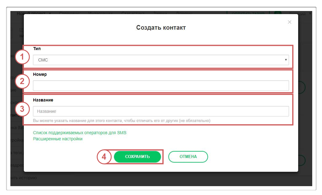 Выбираем “Тип контакта”, указываем его и нажимаем кнопку “Сохранить”.