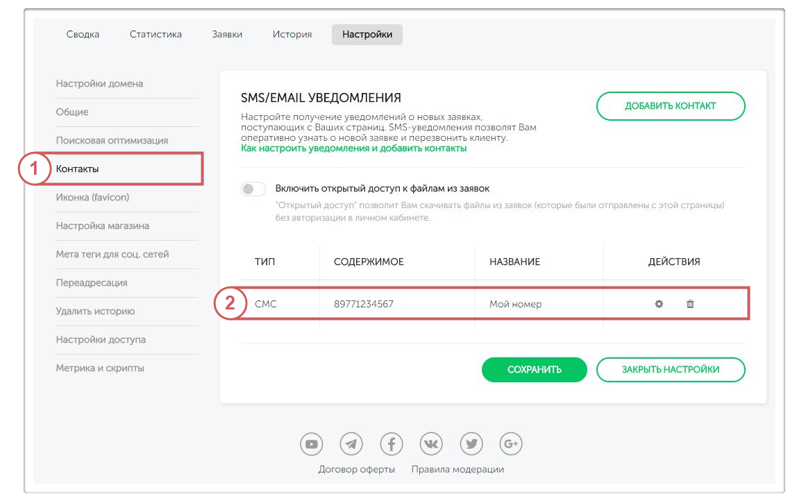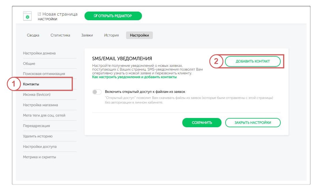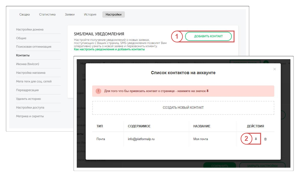 После привязки контакта, на него будут приходить уведомления о заявках с вашего сайта. Нужно привязать контакт к каждой странице, с которой вы хотите получать уведомления.