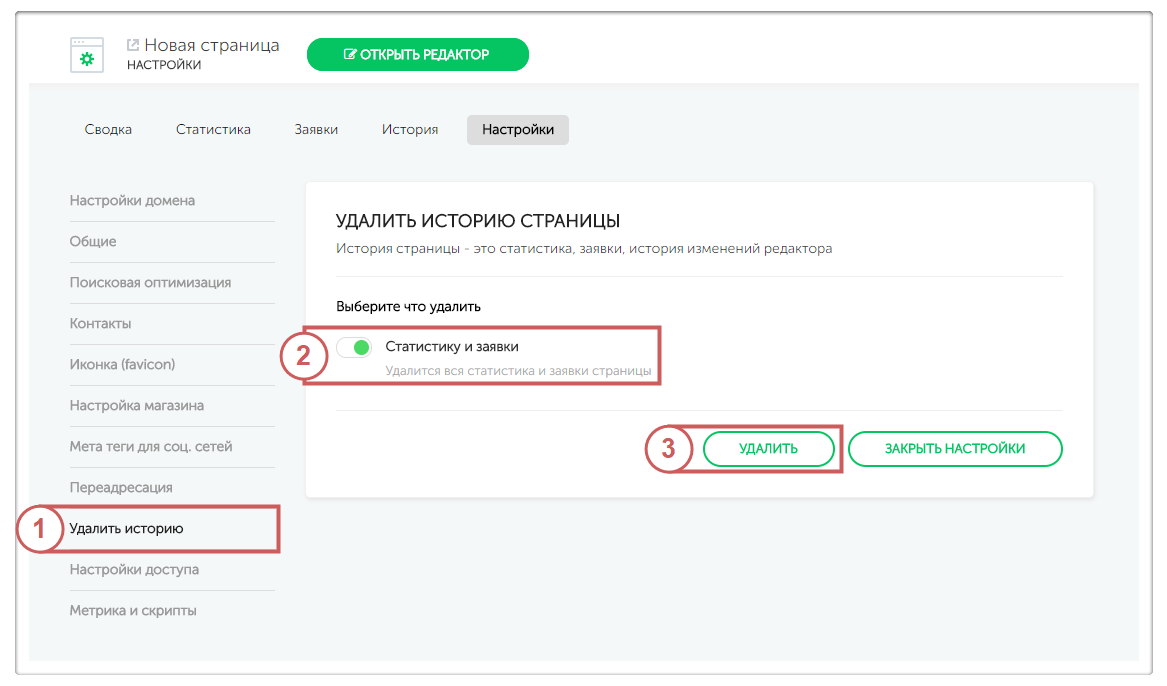Удаляем историю страницы: статистику, заявки и историю изменений.