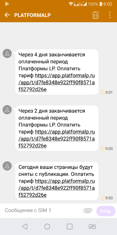 Чтобы не забыть о том, что срок оплаченного тарифа скоро закончится и страницы перестанут быть активны, на Платформе есть возможность получать email и смс-уведомления.