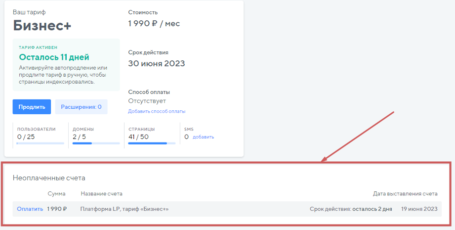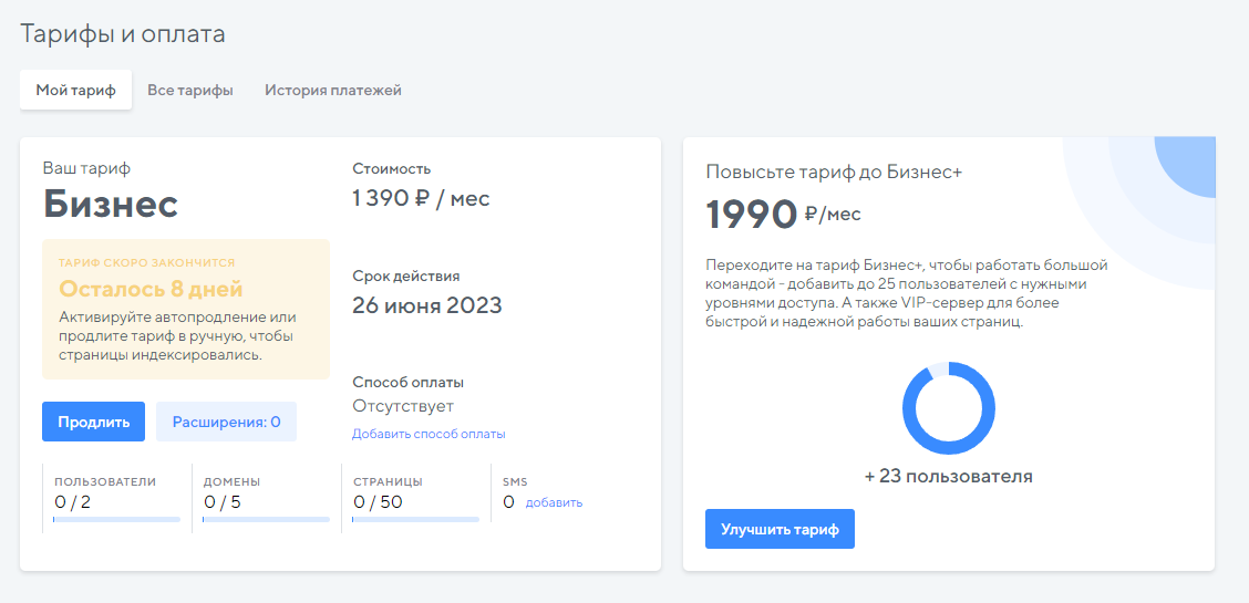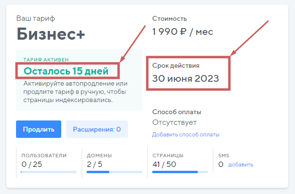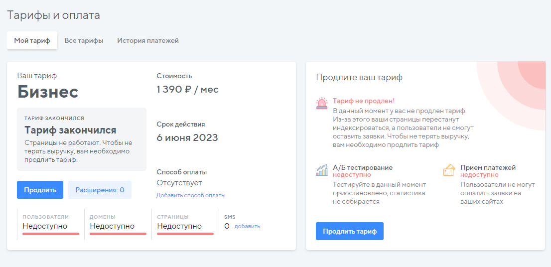 Не волнуйтесь, все страницы и изменения сохранятся. С неоплаченным тарифом можно создавать, редактировать и сохранять страницы. Единственное, что не получится – опубликовать их. Это можно будет сделать после оплаты тарифа.