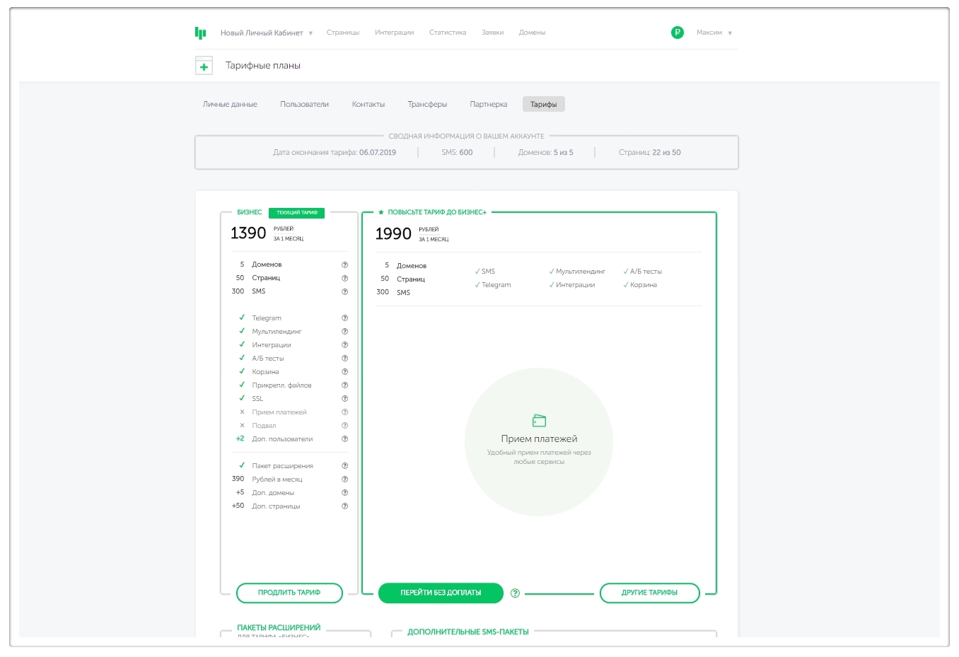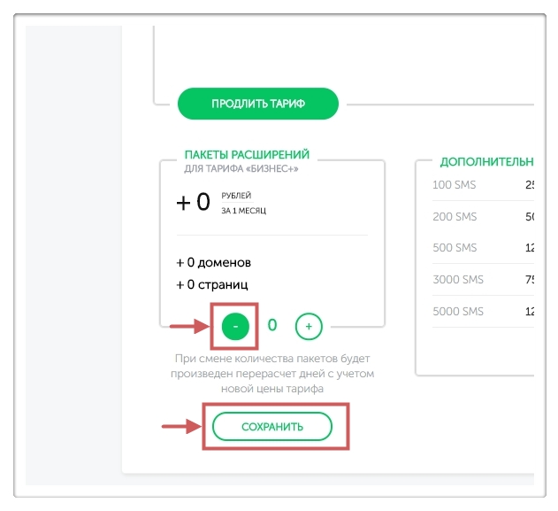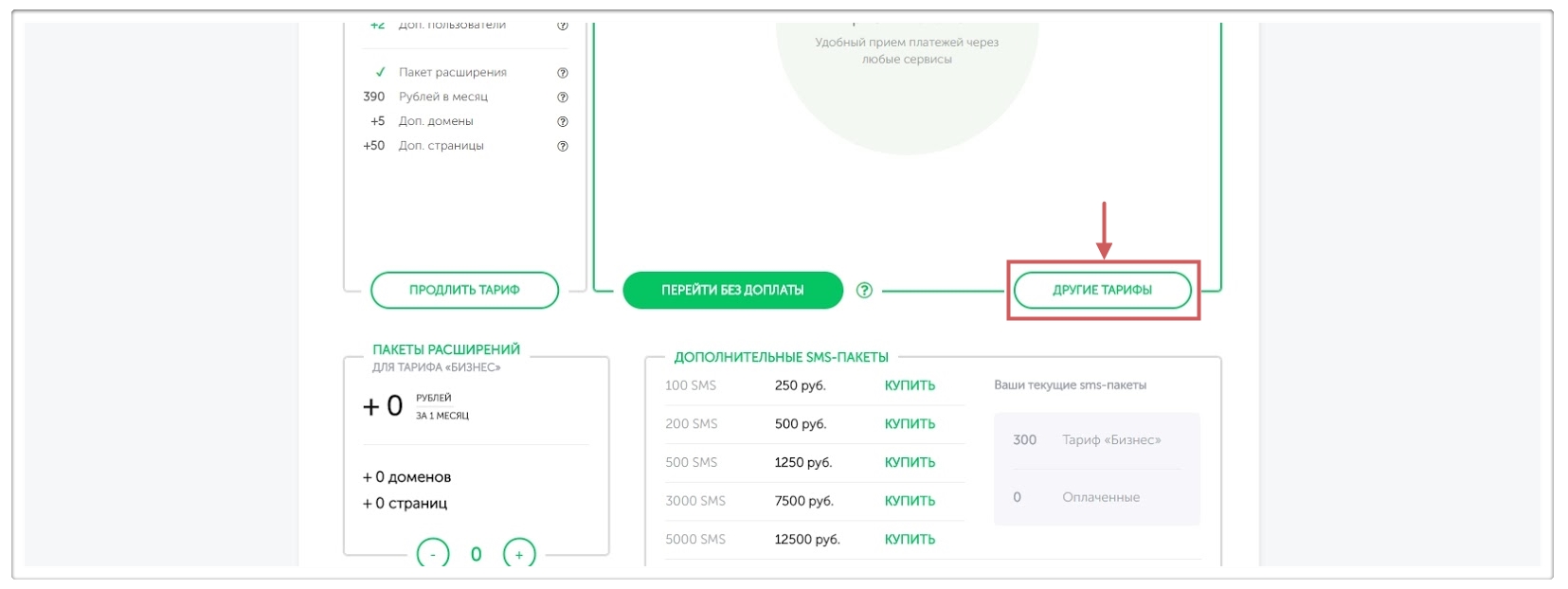 Подсказка:на тарифе “Бизнес+” также можно подключить дополнительные пакеты, которые увеличат количество доменов и страниц на аккаунте (1 дополнительный пакет расширений = +5 доменов и +50 страниц).