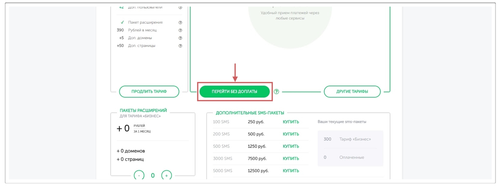 Кнопка “Перейти без доплаты ” позволяет перейти на тариф выше, например, с тарифа “Бизнес ” на “Бизнес+ ”.