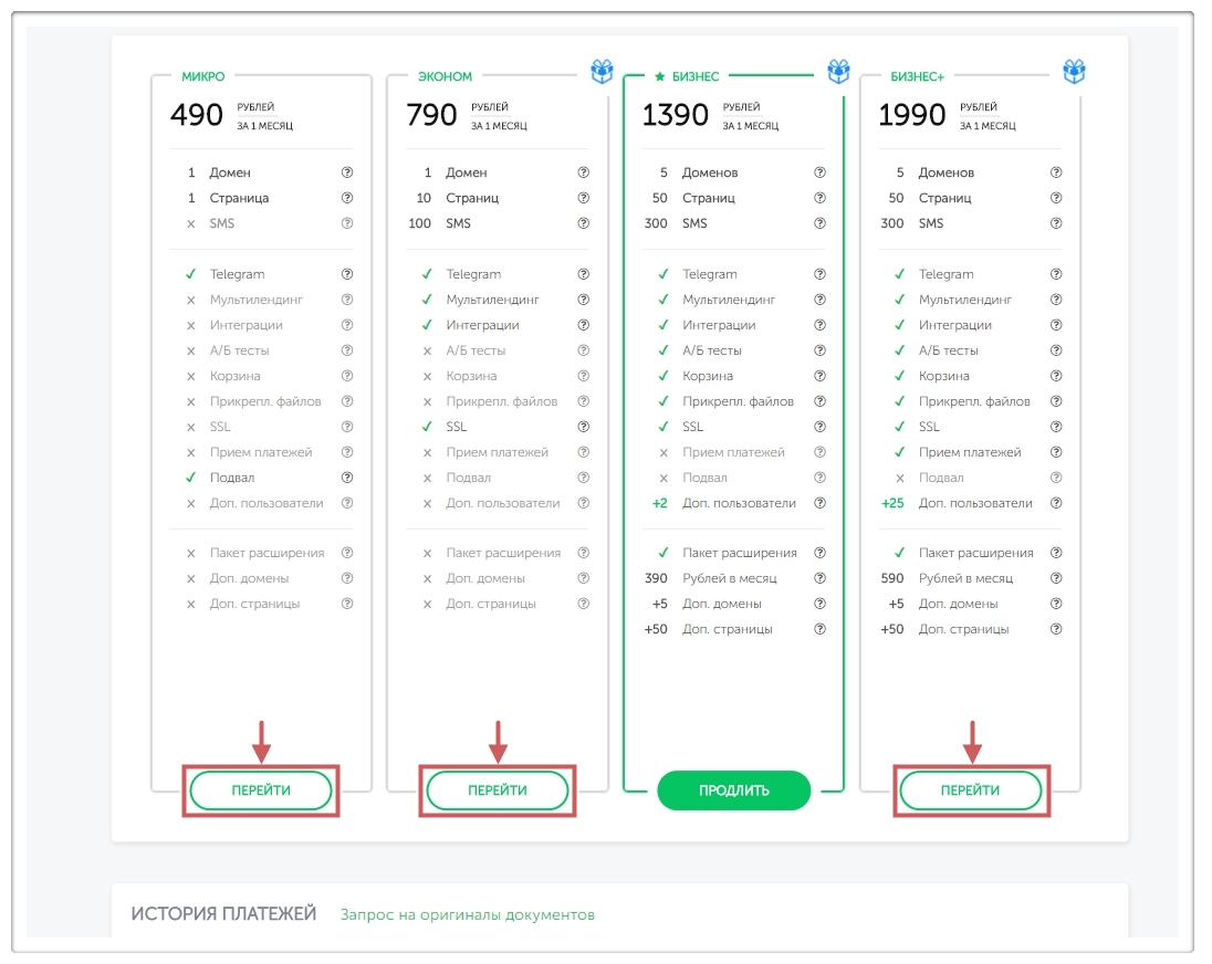 На странице с тарифами есть информация о каждом тарифе, его функциями и ценой. Здесь можно в любой момент перейти на нужный вам тариф.