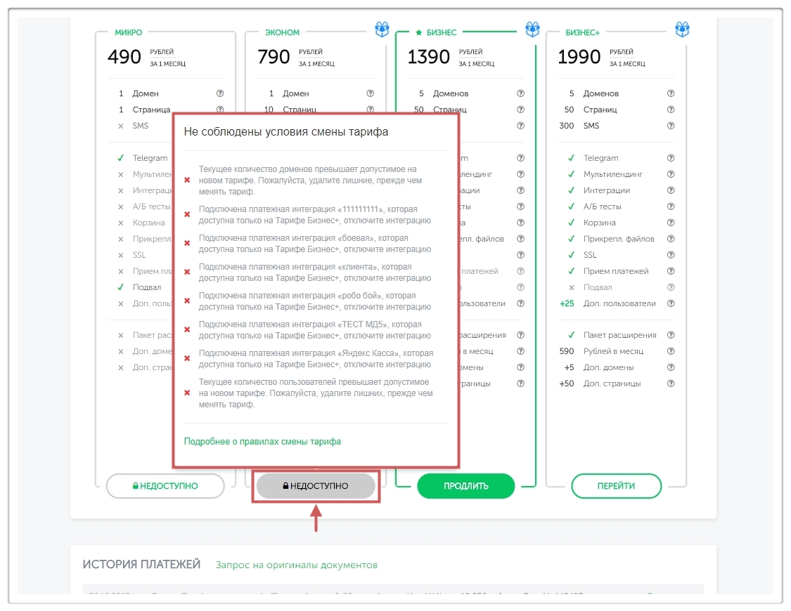 Например, вы решили перейти с тарифа Бизнес на тариф Эконом, тогда придется сократить количество доменов и страниц и отключить интеграции, которые не действуют на новом тарифе.
