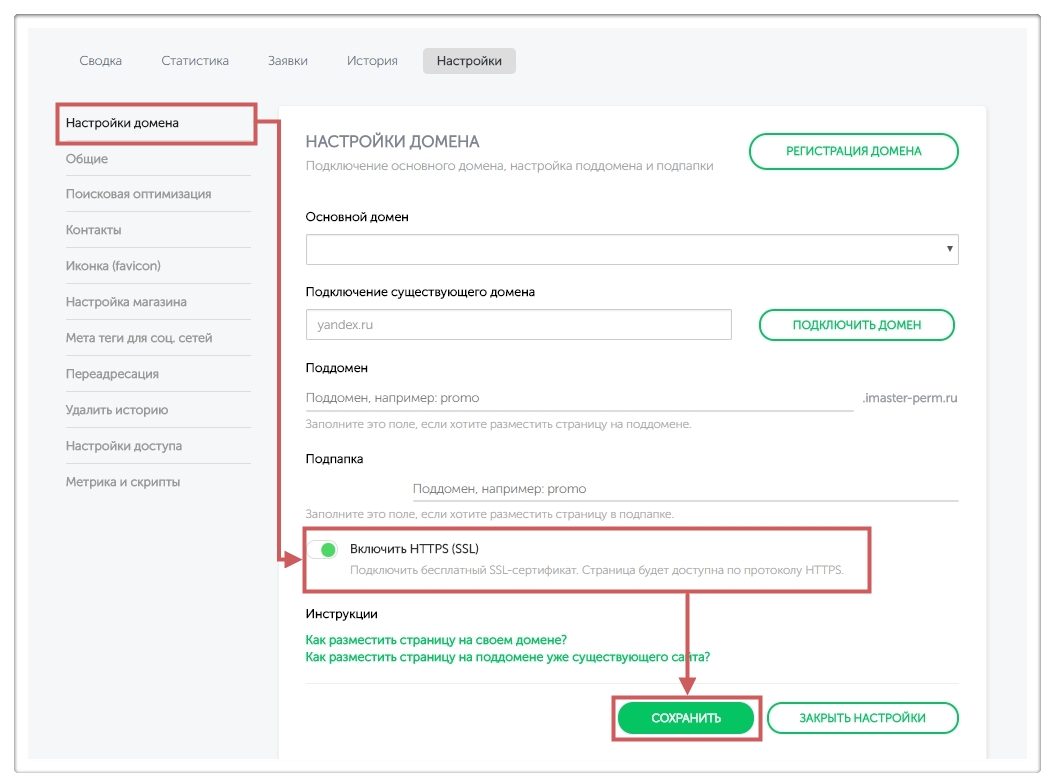 Шаг 2. Во вкладке “Настройки домена ” выключаем настройку “HTTPS (SSL) ”
