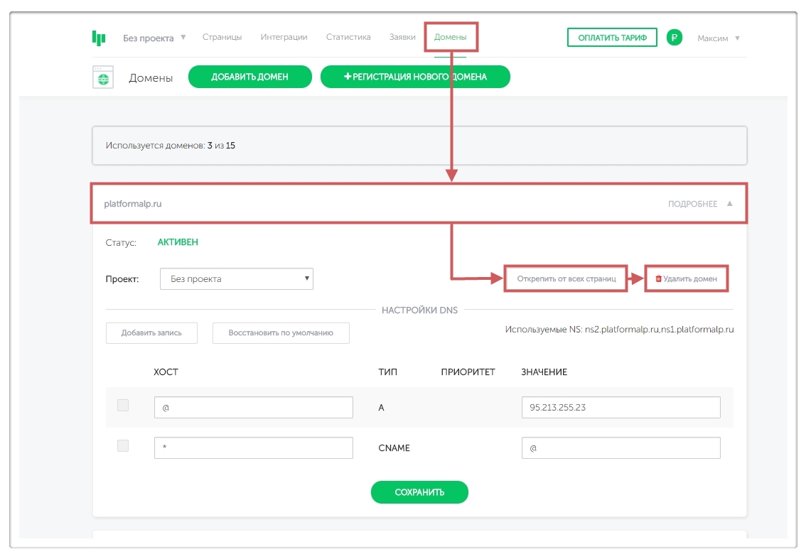 Шаг 2. Выбираем домен, который можно удалить.