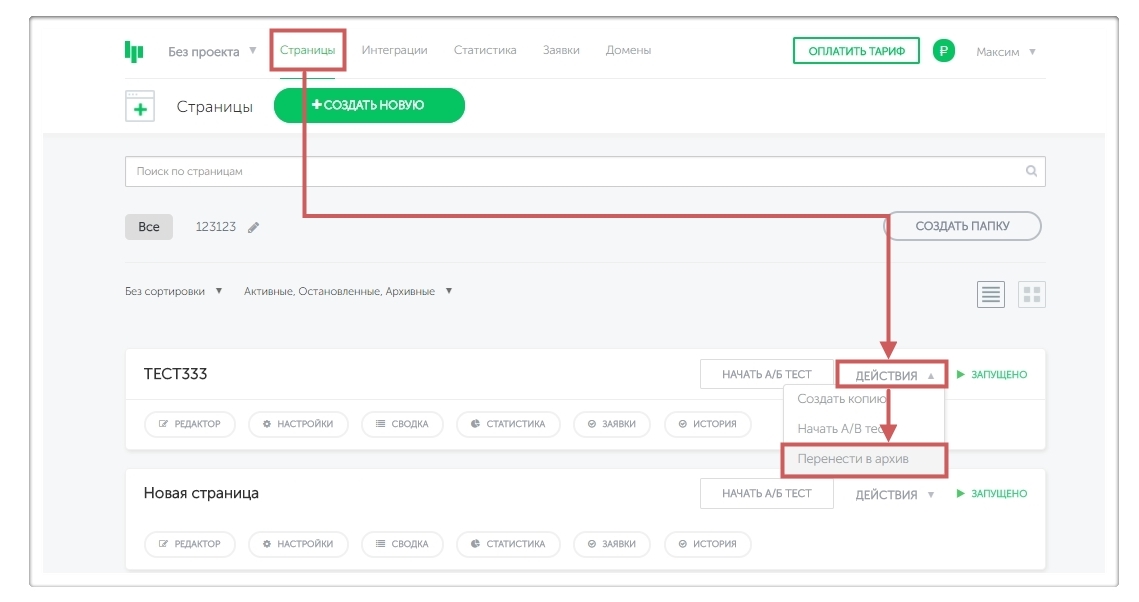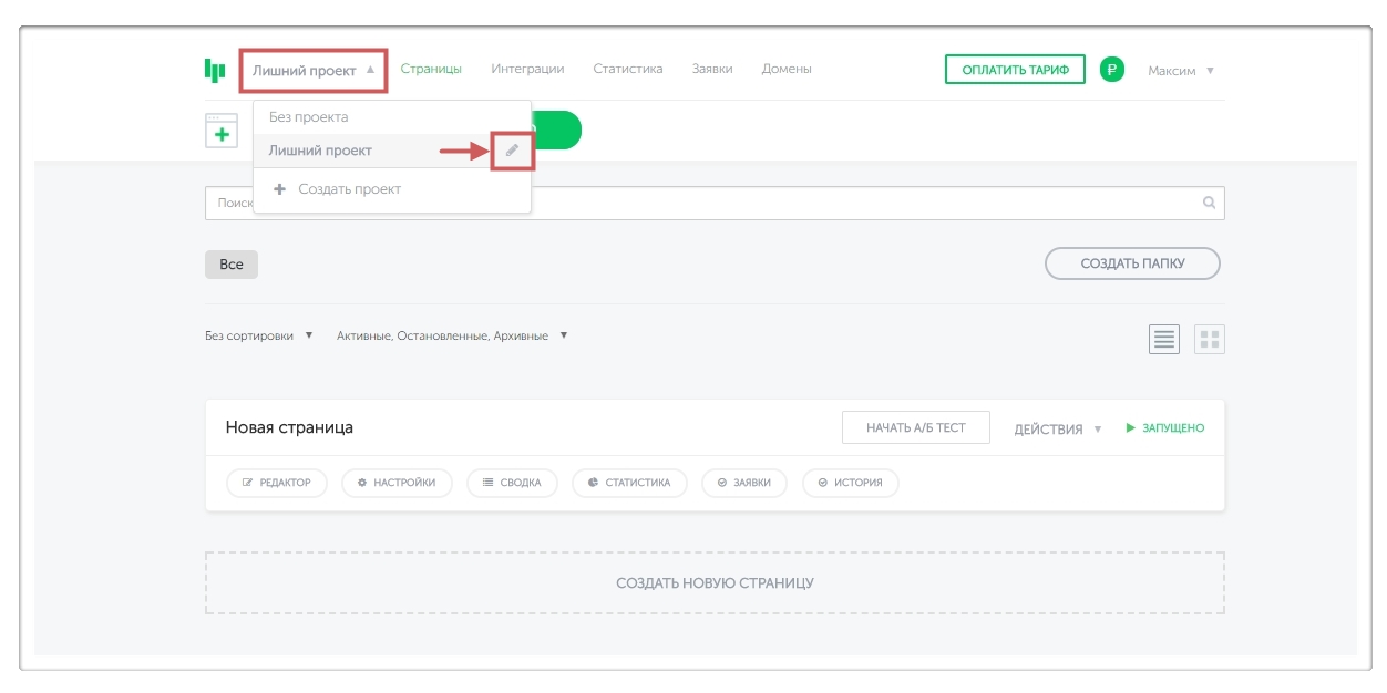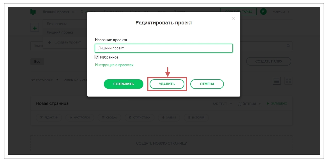 Подсказка: Перед удалением проекта необходимо перенести страницы из него в “Без проекта ”