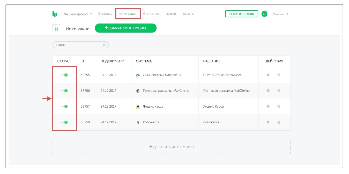 2.5.Отключить интеграции и платежные интеграции