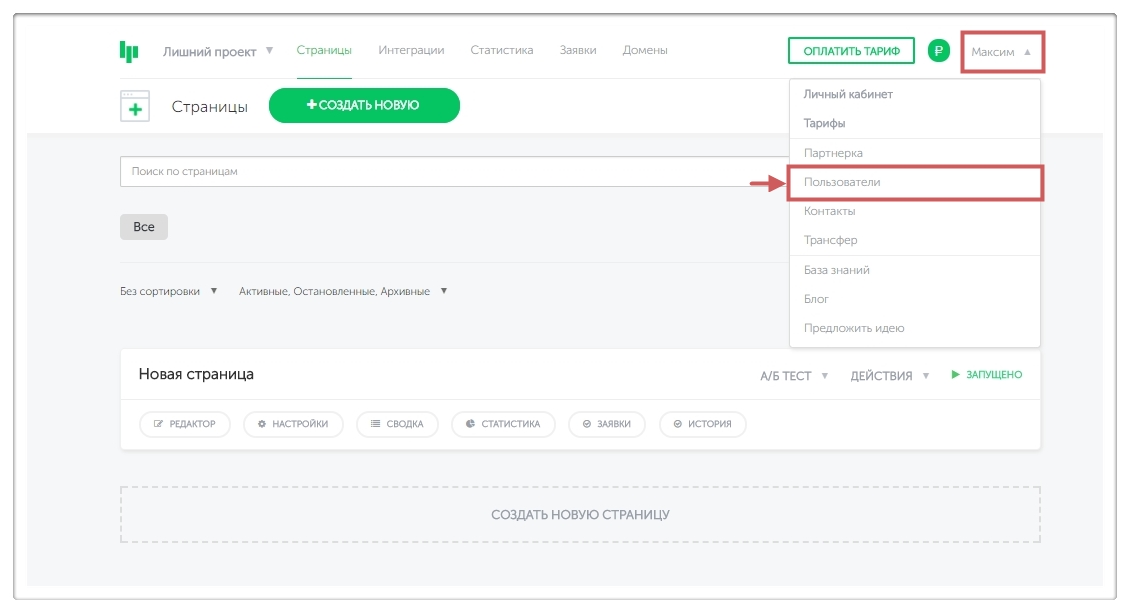 Шаг 1. Перейдём в “Меню личного кабинета ” (имя аккаунта в правом верхнем углу) в раздел “Пользователи ”.