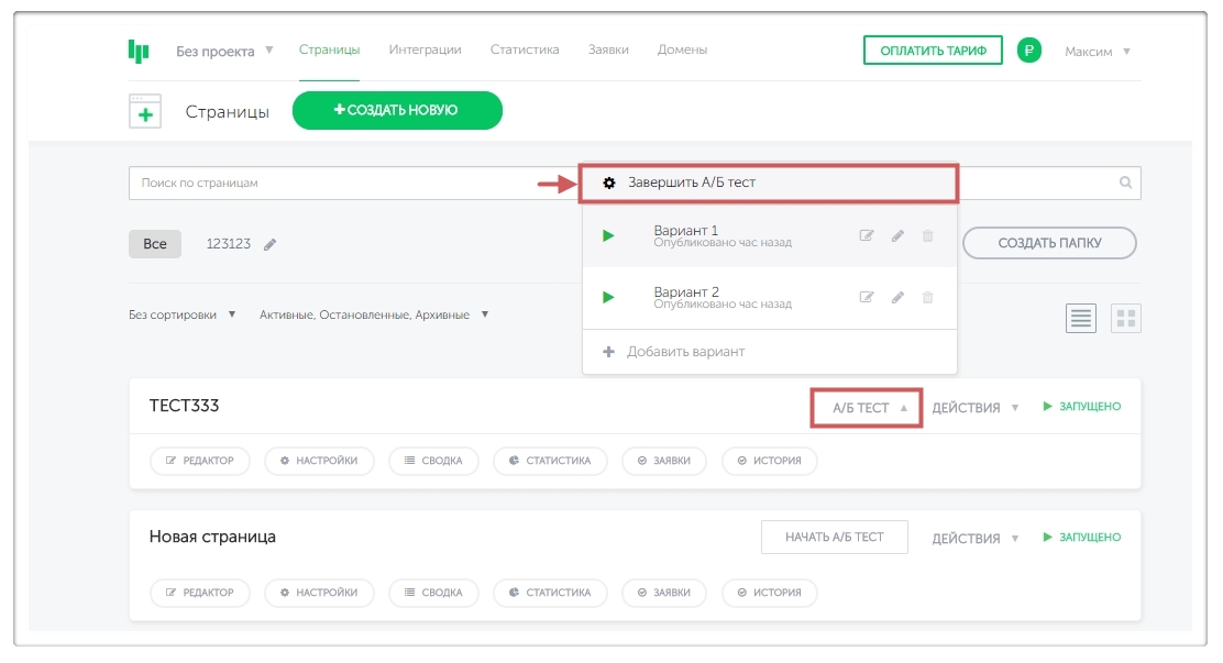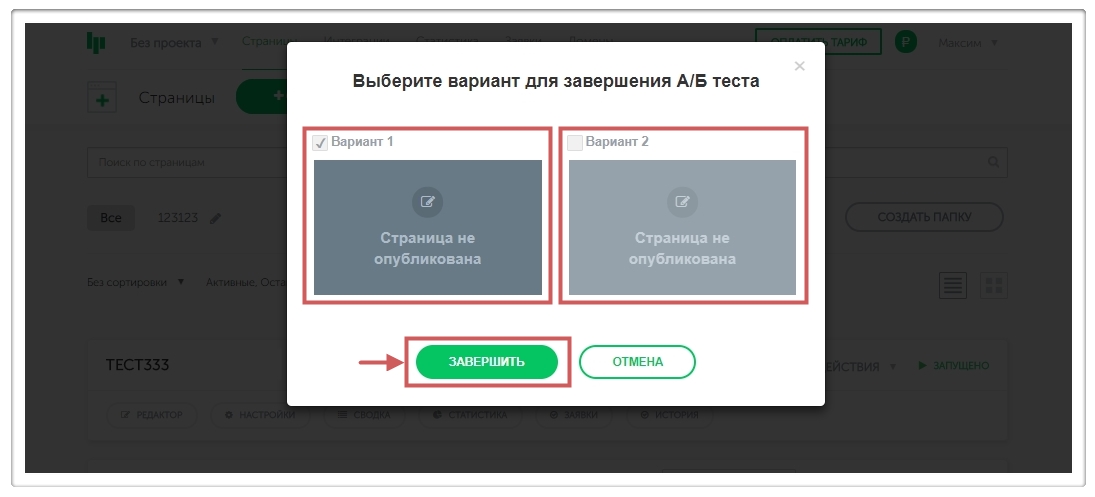 Шаг 2. На странице с запущенным A/B тестированием нажимаем кнопку “А/Б ТЕСТ ” – “Завершить А/Б тест “.